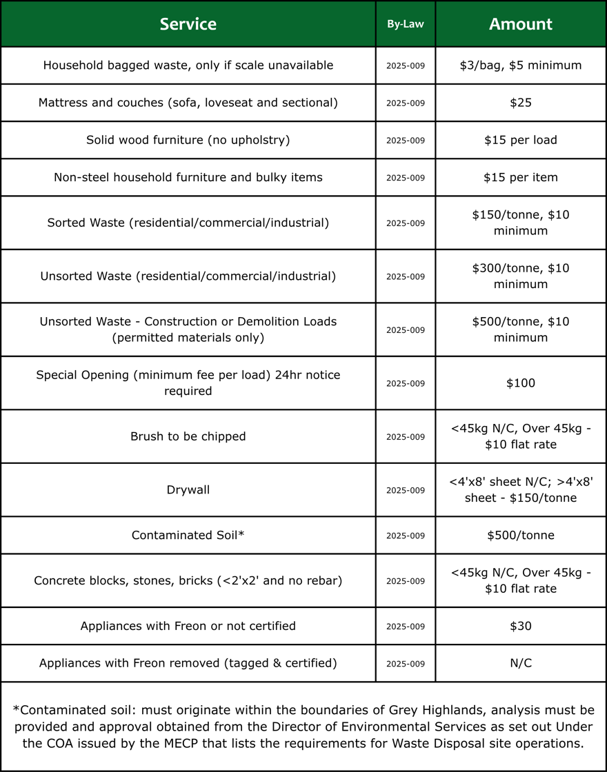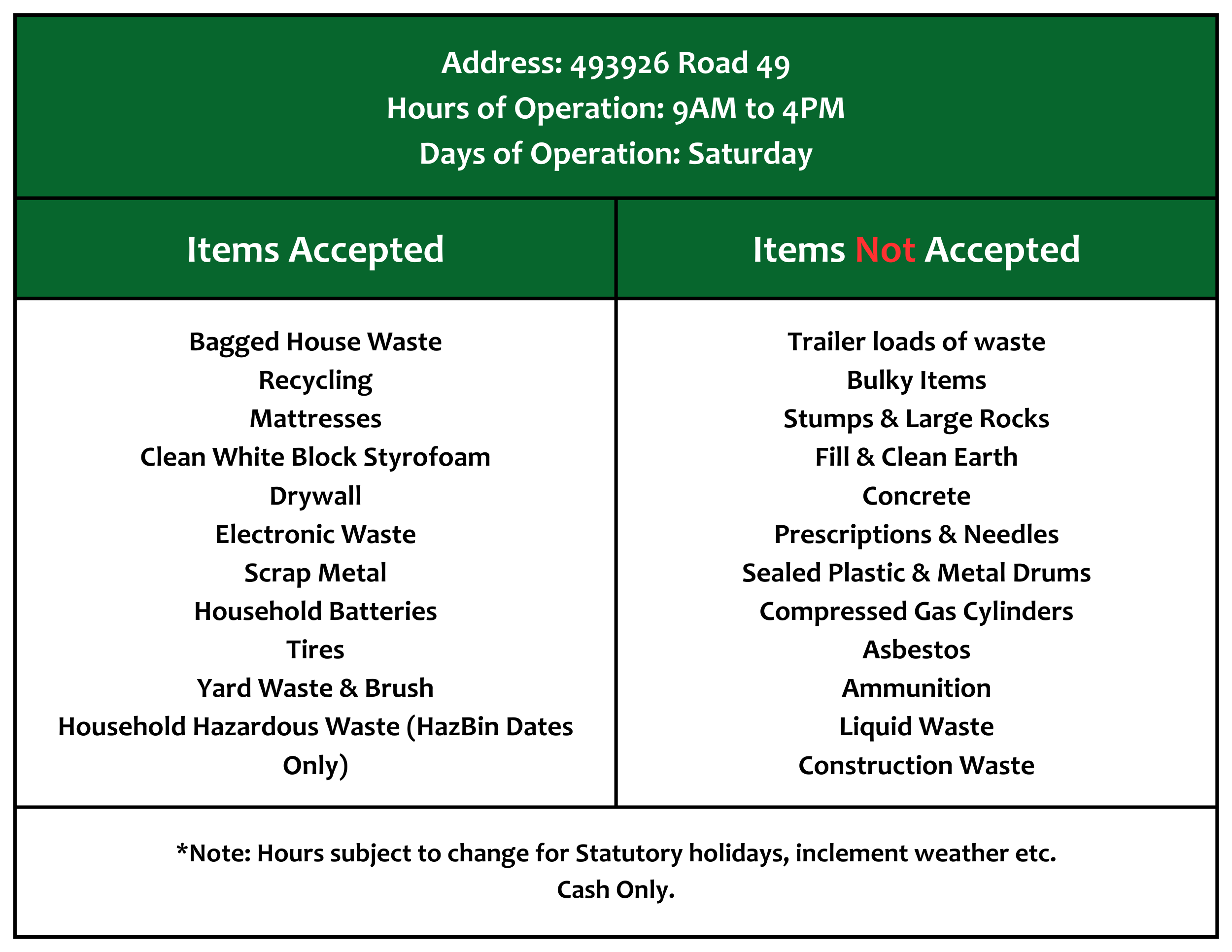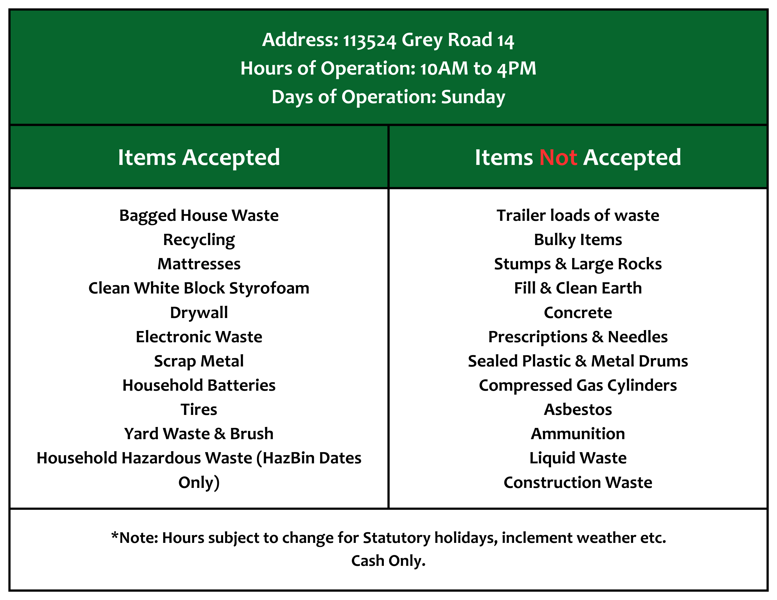 The Municipality of Grey Highlands does not assume any responsibility for items selected or obtained from the Reuse Centre. The Municipality does not warrant or guarantee the items in any way and are taken “as is.”